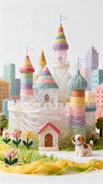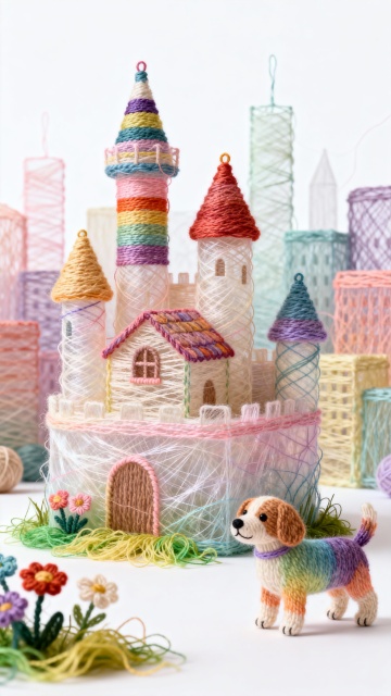 毛线绣织彩虹城堡,透纱围筑,彩塔伴绒犬,织就童话软梦