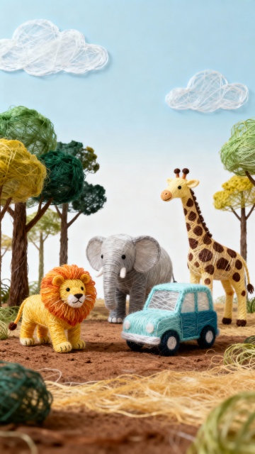 用缠绕的纱线塑出蓬松树冠、柔绒动物(狮、象、长颈鹿),再缀上纱线纹理的小车,配纱线云朵作衬,让柔软纤维裹住野性生灵,把草原秘境揉成触手可及的暖糯梦境,每一缕线都藏着 “用温柔重构自然” 的巧思。