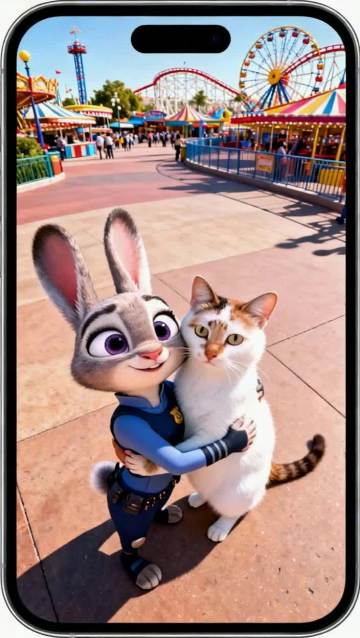 3D动漫风拟人兔警官与真实猫咪温馨互动,卡通感十足的游乐园背景,趣味萌趣十足,虚拟现实融合自然。