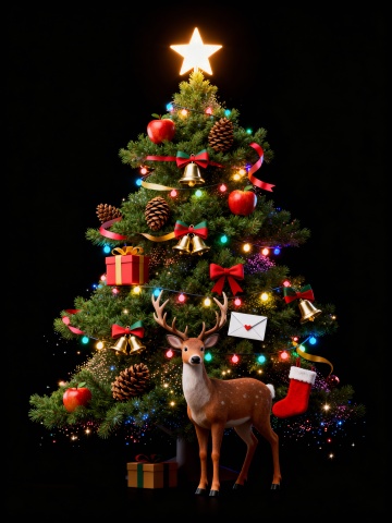 软3D风毛发生长鹿与刺绣风圣诞树,暖光雪瓣点缀,梦幻温馨的节日场景。