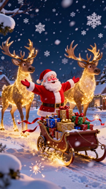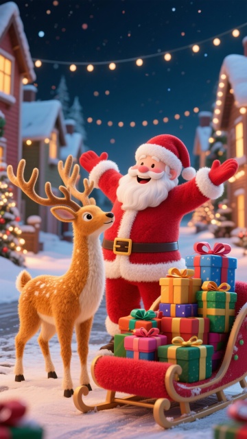 软3D风圣诞场景,卡通感十足的圣诞老人与驯鹿雪橇,搭配梦幻灯光与粘土质感圣诞树,营造喜庆温馨的节日氛围。