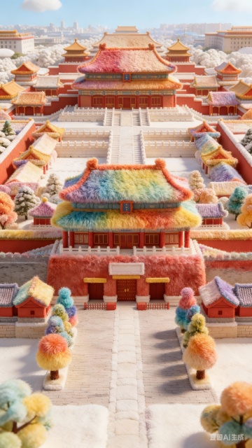 梦幻色彩的毛绒故宫,3D微缩艺术风格,融合卡通感与虚拟现实,呈现冬日童话般的可爱场景。