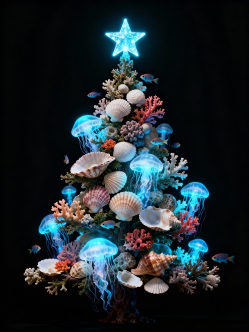 晶莹剔透的玻璃风圣诞树,融合3D几何结构与粒子光效,闪耀梦幻光影,未来感十足,搭配绚丽烟花,营造奢华节日氛围。