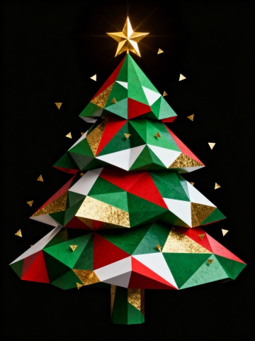 几何风玻璃圣诞树,融合红绿金三色晶透切面,3D立体结构闪耀奢华感,重拟物设计呈现清透质感与喜庆氛围,顶部星饰点亮节日光芒。