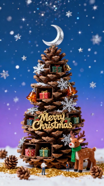 梦幻雪景中的3D浮雕圣诞树,重拟物风格呈现温馨光影,雪花覆盖的体积感与彩灯辉映,营造冬夜节日氛围。