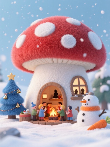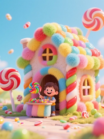 软3D风圣诞小屋,毛发生长质感搭配卡通人物与糖果元素,营造梦幻喜庆氛围,微缩艺术感十足,节日温馨可爱。