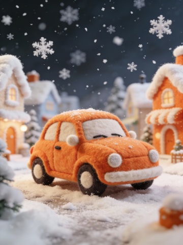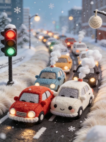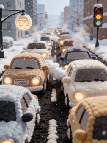 改变冬天的基本元素——雪。在这个世界里,下的不是冰冷的晶体,而是巨大的、温热的棉花糖团和羽绒球。街道、汽车、路灯都被这种极其蓬松、半透明的白色物质淹没。汽车为了在“棉花雪”中行驶,轮胎变成了巨大的毛线球滚轮。