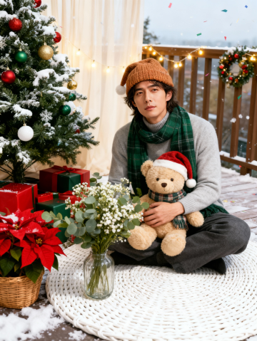 小男孩留短发,戴浅蓝色针织圣诞帽,穿浅蓝色卡通恐龙卫衣、黑色加绒裤,跪坐在浅蓝色毛绒地毯上,怀中抱戴圣诞帽、围格纹围巾的毛绒熊。左侧是覆雪圣诞树(装饰红 / 绿 / 金 / 白球),树下堆红绿色礼盒,周围散落彩色积木、圣诞主题绘本、发光玩具车与毛绒兔子。背景为浅蓝色墙面(贴卡通圣诞贴纸),悬挂彩虹灯带与卡通圣诞挂毯,点缀飘落的雪花与彩纸碎。童趣满满氛围,色调以蓝、粉、白、奶黄为主。