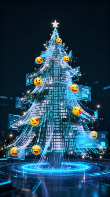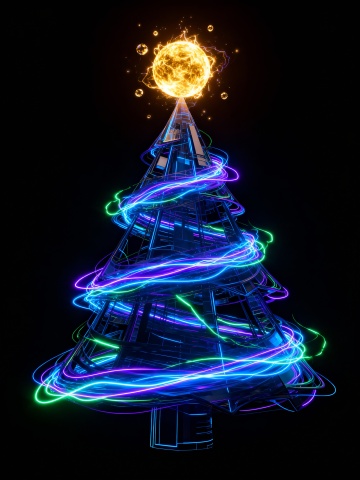 未来感与科技感交织的3D圣诞树,霓虹光带环绕,粒子流闪烁,金属质感枝叶在梦幻光影中跃动,呈现虚拟自然的节日奇观。