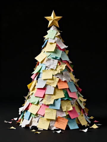 由五颜六色的便利贴组合的巨大圣诞树,圣诞树上缠绕着透明发光的鼠标,粒子流云光线缠绕,圣诞树底下是堆积着发光的键盘。深邃星空背景。高清渲染