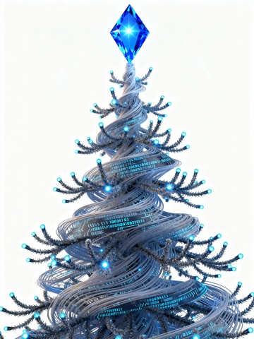 未来感与科技感交织的3D圣诞树,霓虹光带缠绕,液态光影反射,极繁主义设计,神圣星芒闪耀,虚拟现实般的梦幻视觉。