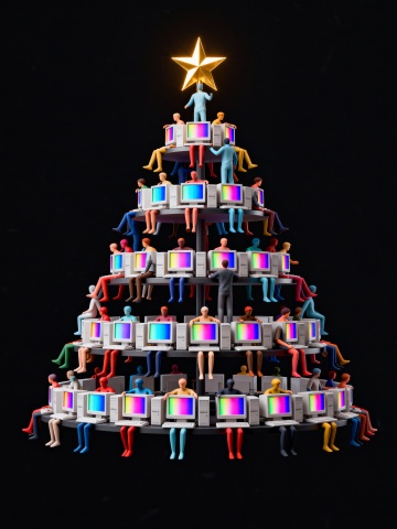 本作品以设计工具与设计元素为灵感来源,将尺子、网格系统、参考线、取色器与图层符号等抽象化为视觉语言,重组为一棵理性而克制的圣诞树。这些看似冷静的工具,构成了创意背后的结构与逻辑。它们并不直接呈现节日情绪,却在无数次修改与推敲中,为作品点亮最终的星光。通过将设计过程转化为节日形象,致敬每一位在规则与灵感之间寻找平衡的创作者。这是一棵属于设计平台和设计师的圣诞树。