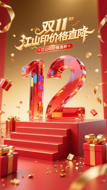 巨大的红色玻璃立体字 “12” ,上方搭配金色 “双11 江山印价格直降” 艺术字。周围环绕红金礼盒、金色丝带、碎金片、双11元素,背景为金色渐变,底部有红色阶梯展台,整体风格热烈喜庆