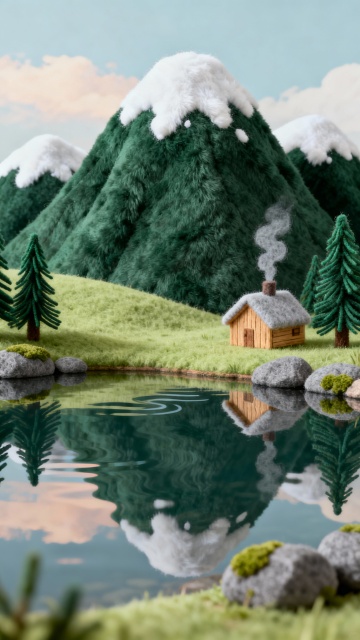 连绵的雪山森林化作了可拥抱的超大号蓬松玩偶。山体是柔软的莫代尔绒,松树是绿色的毛线球簇,云朵是蓬松的棉花糖。天空是粉紫渐变的梦幻色调,整体风格如同吉卜力工作室的动画场景,宁静、辽阔,充满天真无邪的想象力。