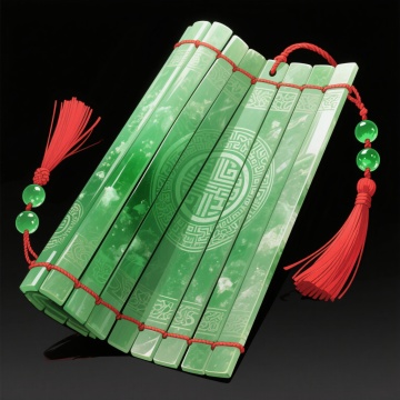 中式古典插画风,绿色竹简配红绳流苏,轻拟物设计展现国潮韵味。