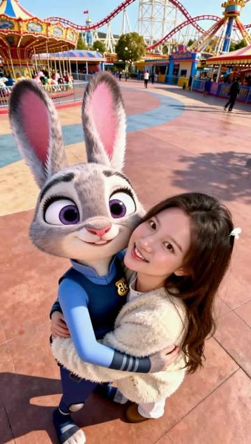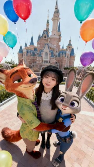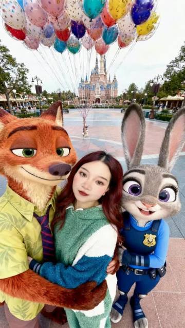 梦幻感与卡通感交织,3D角色风结合毛发生长细节,呈现温馨趣味的迪士尼乐园场景,动漫风设计手法赋予画面生动可爱氛围。