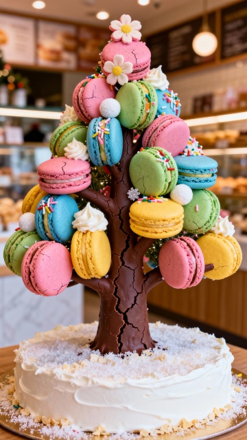 冬日场景,一棵由多肉植物组成的圣诞树,树干是粗壮的龙骨多肉,深绿色,带白色纹路,树枝是不同品种的多肉,包括熊童子、玉露、虹之玉,叶片饱满多汁,装饰是小巧的陶土星星和彩色石子,底部是粗陶花盆,铺着白色铺面石,背景是阳光充足的阳台,明亮色调,高饱和度,多肉叶片纹理清晰,带轻微绒毛质感,治愈自然氛围