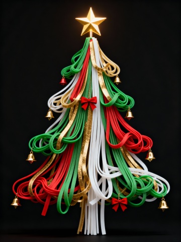 3D风格圣诞树由红绿金三色袜子堆叠而成,融合重拟物与面料质感,点缀金属铃铛与金色星星,营造浓厚喜庆氛围。