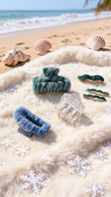 海洋风贝壳圣诞树,树干是白色海螺壳(带螺旋纹理,表面光滑),树枝是不同形状的贝壳(扇贝、蛤蜊壳、海螺壳,白色、粉色、棕色),装饰是珊瑚碎片(红色、粉色,带孔洞)、珍珠(白色,带光泽)、小海星,底部是蓝色细沙底座(铺白色贝壳碎片),背景是海边小屋,自然光照射,超写实细节,贝壳表面带轻微水渍,清新海洋氛围