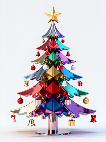 几何风玻璃圣诞树,融合红绿金三色晶透切面,3D立体结构闪耀奢华感,重拟物设计呈现清透质感与喜庆氛围,顶部星饰点亮节日光芒。