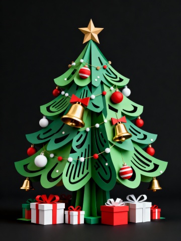 剪纸风与拼贴风结合的圣诞树,红绿金白层层叠叠,几何造型简约生动,金色星星点亮节日喜庆,温馨趣味跃然纸上。