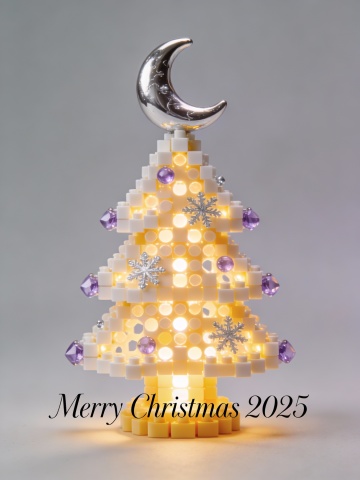 像素风微缩圣诞树,暖光透出温馨梦幻感,金属弯月与晶钻点缀,塑料质感萌趣可爱,2025节日氛围满溢。
