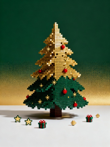 像素风圣诞树,鎏金与墨绿交织,微缩艺术感十足,金属质感点缀节日喜庆,温馨趣味兼具。