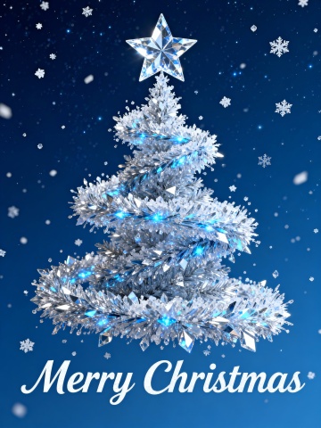 梦幻感3D圣诞树,玻璃质感与鎏银光泽交织,虚拟自然雪景中闪烁晶莹星光,营造冬日童话氛围。