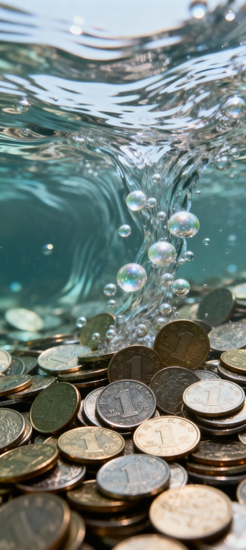 水下摄影展现金属硬币堆叠的实景感,清透气泡与光影交织,液态风流动中凸显金属光泽,营造梦幻金融意象。
