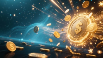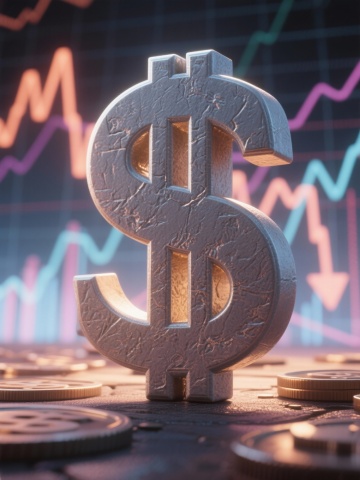 现代感3D风设计,超级符号美元标志,环绕金币与炫彩星星,彰显财富主题。