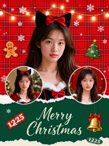 撕纸风拼贴设计,融合手账元素与浮雕质感,红绿配色营造喜庆甜蜜氛围,圣诞主题点缀可爱感十足,节日祝福跃然纸上。