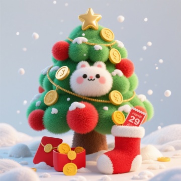 毛绒可爱圣诞树和金币