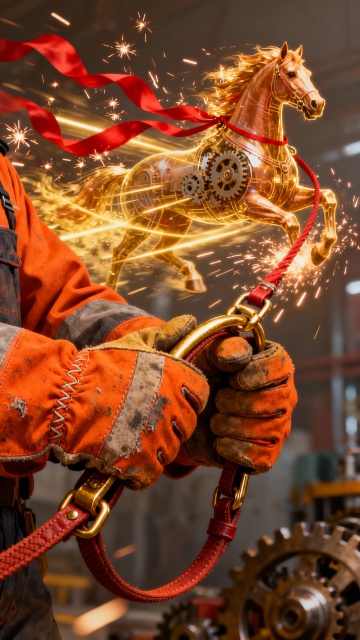 蒸汽波风与复古工业美学交织,金属机械马身披鎏金齿轮,融合超现实主义构图,展现科技与怀旧的碰撞。