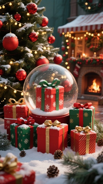 超写实风格圣诞场景,以红色和绿色为主色调,温暖柔和的侧光照明,前景是多个包装精美的圣诞礼物盒,包括红色带雪花图案、绿色带雪花图案、红色带金色条纹等款式,部分礼物盒上覆盖着少量蓬松的白雪,礼物盒周围点缀着松针和松果,背景是装饰有红色球形饰品和闪烁暖黄色串灯的圣诞树,树的枝叶上也有积雪,整体营造出温馨、喜庆、充满节日氛围的画面,不同画面的背景可替换为圣诞市场摊位、壁炉旁、挂满装饰的房间角落等具有圣诞元素的场景,保持相同的光影质感和色彩和谐度。