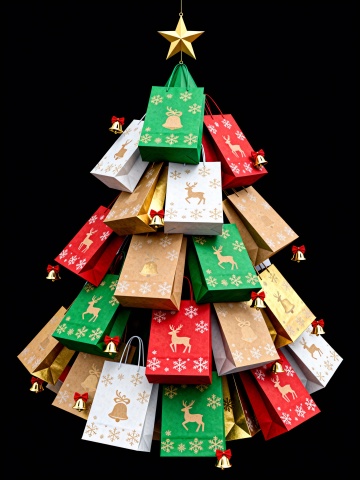 3D风格圣诞树由红绿金三色袜子堆叠而成,融合重拟物与面料质感,点缀金属铃铛与金色星星,营造浓厚喜庆氛围。