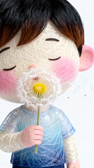 软3D刺绣风,毛发生长质感,童趣男孩轻吹蒲公英,梦幻清新,温馨可爱,传递春日柔情。
