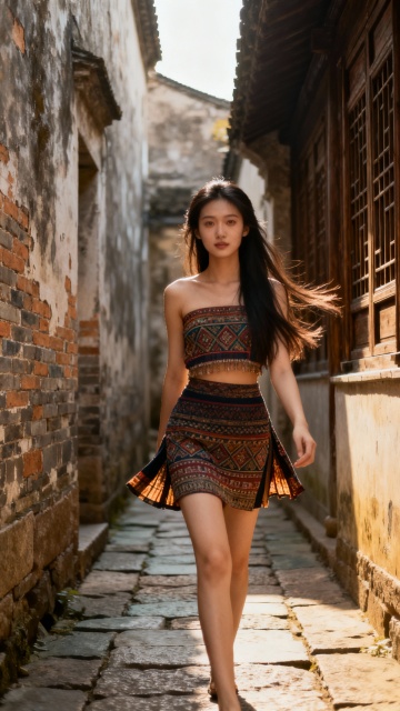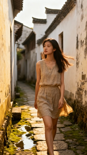 清新中式实景,少女白裙轻舞,阳光洒落古巷,尽显灵动之美。