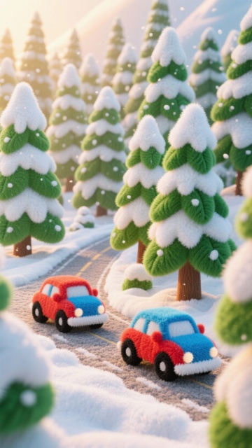 超精细手工钩针编织风格的冬日工厂全景,以红白相间的大型盾构机为视觉中心,盾构机放在覆盖着蓬松白色钩针“积雪”的灰色传送带上,传动带下是蓝白交错、带有裂纹纹理的钩针“结冰湖面”。盾构机周围环绕着不同形态的钩针机械设备,顶部点缀白色“积雪”,背景是层叠的钩针编织雪山,山顶覆盖厚实“白雪”,山间飘荡着云朵状钩针“雾气”。近空中增添象征阿尔卑斯山的钩针缆车细节,整体画面通过毛线的质感和立体感营造出温暖、梦幻的冬日氛围,所有元素保持一致的手工编织纹理和饱满的色彩过渡,雪花以细小的白色钩针颗粒点缀其间,形成层次分明、充满童趣的冬季设备工厂全景图。