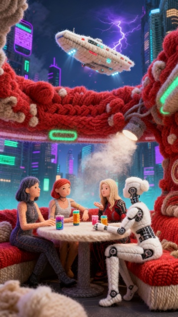 软3D毛发生长风融合赛博朋克与卡通感,未来城市夜景中,机器人与人类在针织咖啡馆畅谈,飞碟掠过闪电夜空,梦幻科技氛围浓厚。