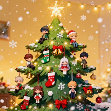 一棵装饰华丽的圣诞树,树上挂着各种人物手办作为装饰品,手办造型多样,有动漫角色、超级英雄等,树顶有闪亮的星星,周围散落着礼物盒,整体氛围温馨喜庆,充满节日气息