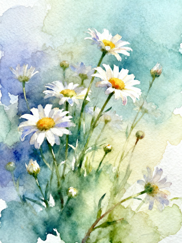 纯净的蓝天飘着几朵白云,下方是开阔的青草地,水彩画风格,色彩淡雅,画面简洁,笔触自然,无多余装饰元素。可作为背景使用。