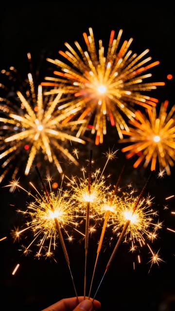 一张高清晰度的礼花摄影照片,黑色纯背景,中央绽放多朵不同样式的绚烂礼花,主要呈现明亮的橙黄色与金色光芒,部分礼花带有红色渐变,细长的烟火轨迹从底部向上四射,末端点缀着闪烁的金色火花,整体光影效果强烈,高光部分明亮耀眼,阴影细节丰富,展现出礼花爆炸瞬间的动态美感与节日欢庆氛围,无任何文字、LOGO及二维码元素。