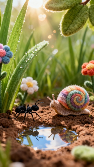 羊毛毡手工艺术的质感,借鉴了手作毛毡玩偶的蓬松肌理与温暖配色,还原出动物们软绒绒的触感; 微缩童话森林的场景设定,类似宜家“思克蒂瓦”系列的森林主题玩具,用巨型蘑菇、苔藓草地营造出缩小的奇幻自然空间; 治愈系萌系设计逻辑,结合了毛茸玩具的Q版造型+移轴摄影的微缩视角,让动物互动像真实存在的童话日常。