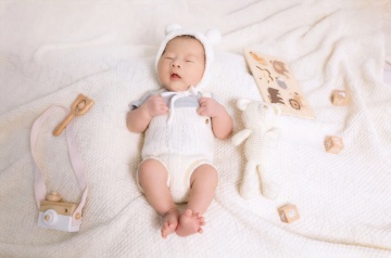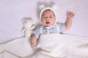 明亮柔和的室内自然光下,一位亚洲婴儿坐在浅色木地板上的白色柔软地垫上,穿着米白色针织连体衣,双手开心地向上举起,脸上洋溢着灿烂的笑容,背景中挂着蓝灰色系的三角旗装饰,整体画面温馨治愈,色调温暖柔和,光线均匀自然,婴儿的皮肤质感细腻,服饰纹理清晰,构图居中,展现出婴儿活泼可爱的瞬间。