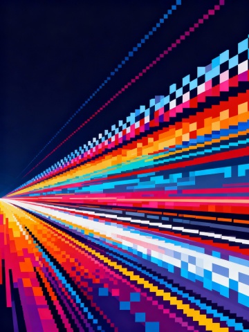 高速运动的动态场景,由无数细小的彩色马赛克方块构成,每个马赛克单元都清晰可见,展现出独特的颗粒质感与材质细节,整体画面充满强烈的速度感与动感,色彩鲜明且富有冲击力,光影效果突出运动轨迹,营造出科技感与未来感兼具的视觉体验。