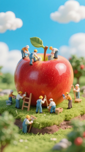 微缩艺术风与拟人风结合,3D质感的巨型樱桃上,小工人忙碌作业,超现实主义场景充满趣味感,粘土风格细腻生动,呈现夏日田园童话。