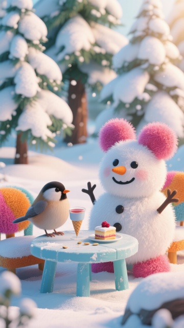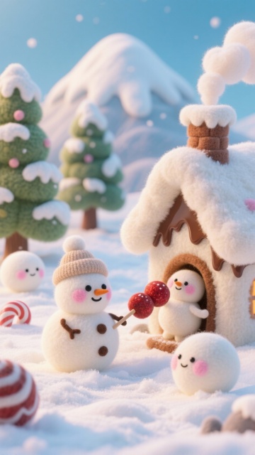 毛发生长风软3D雪人守护微缩姜饼屋,暖光映衬梦幻冬夜,卡通感与温馨感交织,雪花纷飞中尽显甜蜜可爱。