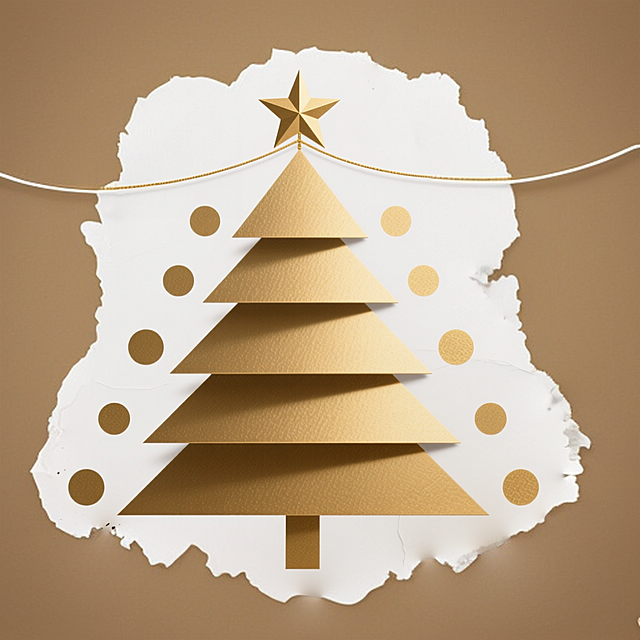 撕纸风圣诞树,层叠几何造型,暖色系点缀,金色雪花环绕,传递喜庆温馨与趣味感,简约主义设计彰显节日氛围。详情