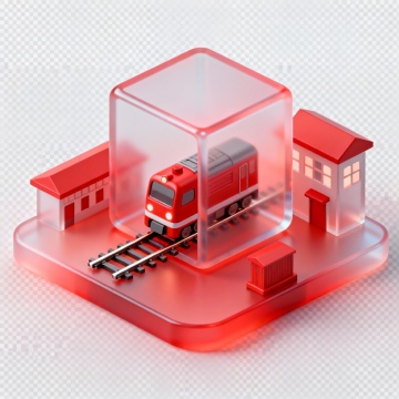 2.5D图标,可视化风格,中间有火车和挺铁路,周围有附属建筑,毛玻璃风格,科技蓝,细节简洁,背景透明,智慧铁路