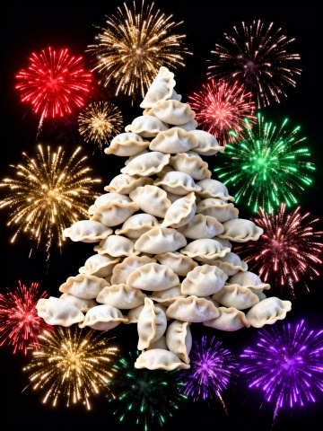 梦幻感与喜庆感交织的3D风圣诞树,融合霓虹灯风与粒子风效果,烟花绽放于星空下,光影交错,呈现赛博朋克风的虚拟自然奇景。